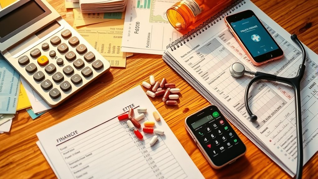 To budget for medical bills and medications, start by reviewing your health insurance plan to understand what’s covered and what isn’t. Track your out-of-pocket costs like copayments and deductibles, and set aside a dedicated emergency fund for unexpected expenses. Regularly save small amounts, monitor your health expenses, and consider supplementary insurance if needed. Managing your healthcare costs proactively keeps stress low and finances in check—continue exploring strategies that will help you stay on top of these costs.
