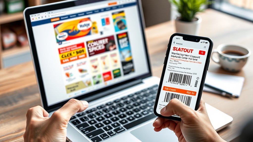 To maximize savings with manufacturer coupons online, start by searching coupon sites, brand pages, and Amazon’s “Coupons” section for deals. Clip or copy digital codes and check if store policies allow stacking coupons with other discounts or cashback offers. Use apps to load coupons directly onto your accounts and combine multiple coupons or promos for larger savings. If you keep exploring, you’ll discover even more tips to stretch your budget further.