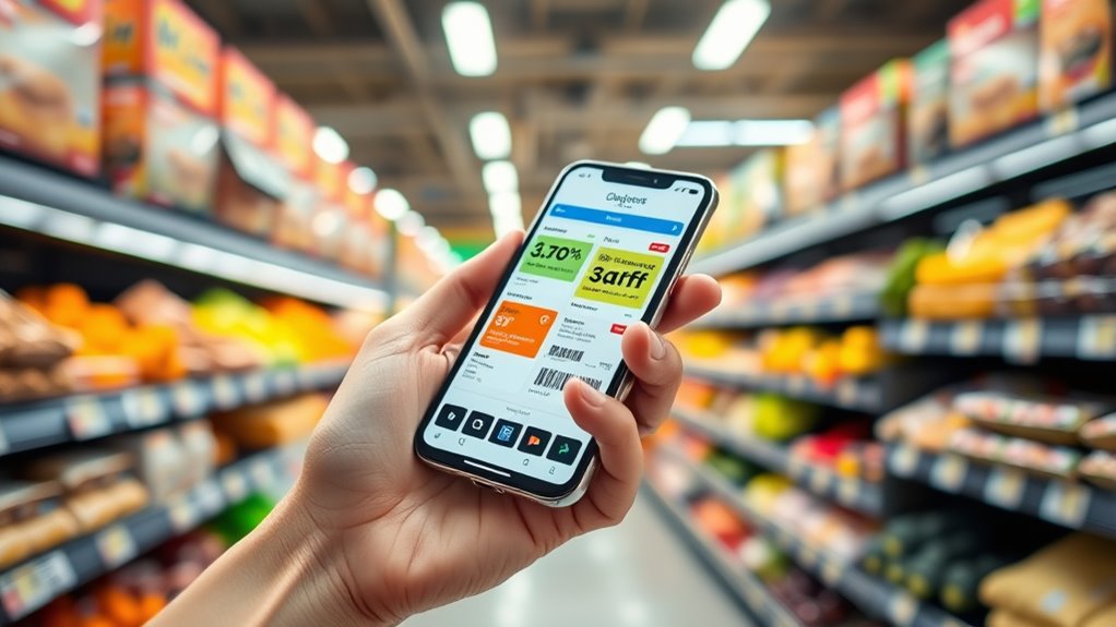 Using phone apps for in-store deals with mobile wallet coupons makes shopping faster, easier, and more secure. You can access discounts instantly, skip paper coupons, and enjoy personalized offers based on your habits. These digital coupons reduce theft risks and protect your information with encryption and biometrics. Plus, they help you shop more sustainably by eliminating waste. Interested in discovering how to maximize these benefits and unleash smarter savings? Keep exploring to learn more.