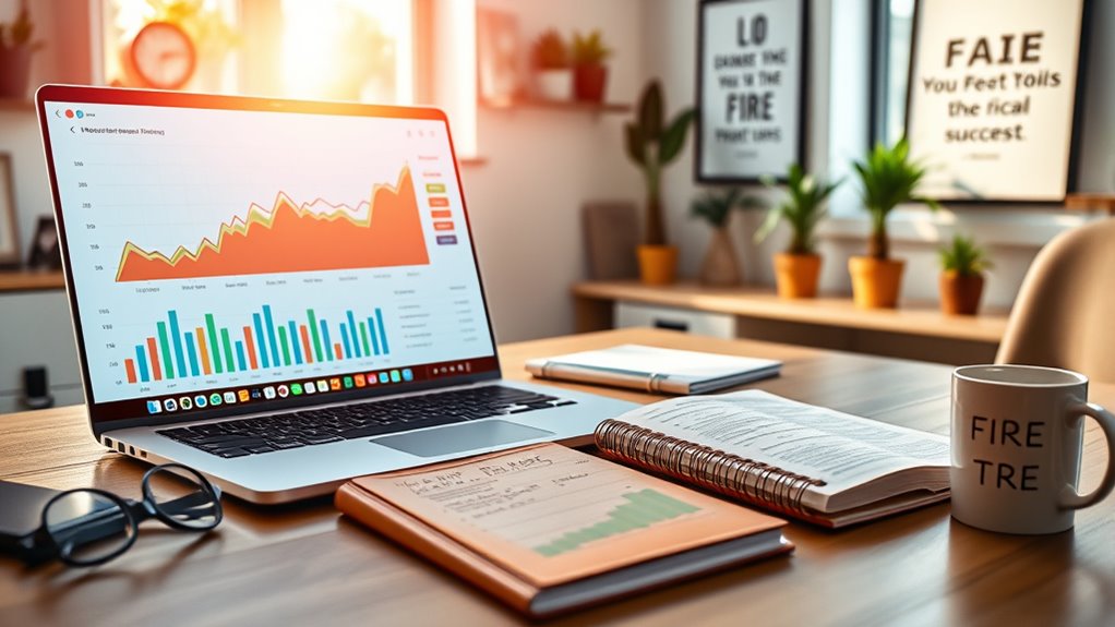 Setting clear savings goals is essential for turning your financial plans into reality. When you define specific targets, you know exactly what you’re working toward, whether it’s building an emergency fund, paying off debt, or saving for early retirement. Break your goals into manageable milestones to stay motivated and track your progress. Decide how much you need to save each month and set deadlines to create a sense of urgency. Clear goals help you prioritize your spending and avoid unnecessary expenses. They also keep you accountable, making it easier to stay disciplined. Without defined objectives, it’s easy to lose focus or get sidetracked. By establishing precise savings goals, you’re more likely to stay motivated and reach your FIRE ambitions faster. Incorporating financial discipline strategies can further enhance your ability to stay on track.