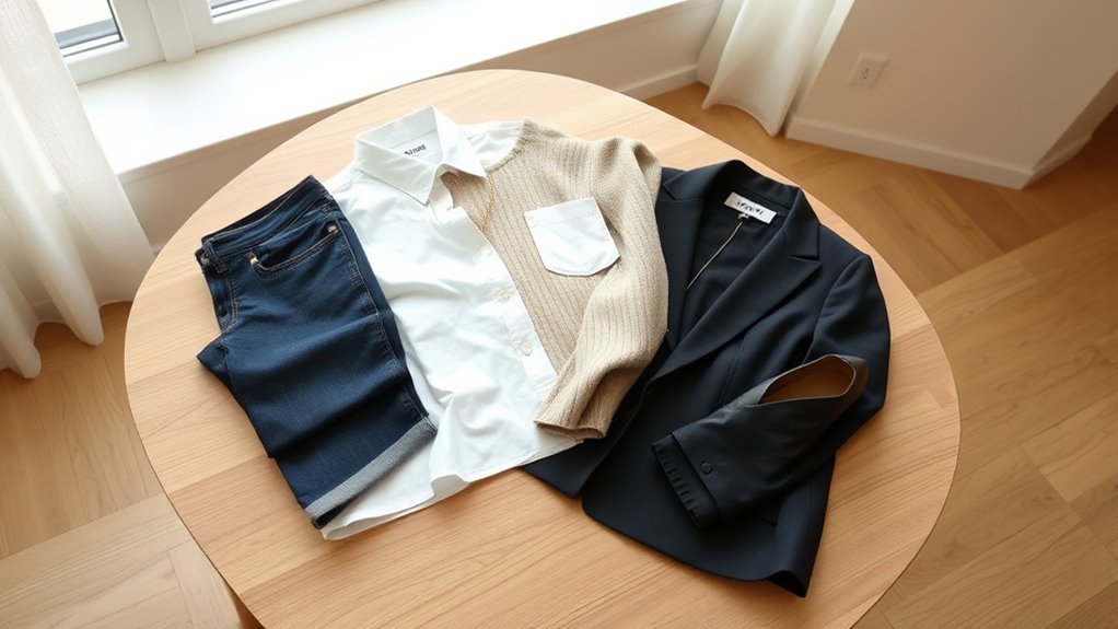 To make sure your capsule wardrobe fits all seasons, focus on seasonal layering and choose versatile fabrics like wool, cotton, and silk. Mix and match pieces that can be layered for warmth or worn alone in warmer weather. Prioritize neutral colors for easy pairing, and include a few adaptable accessories. This approach helps you stay stylish year-round without overcrowding your wardrobe, maximizing both function and budget.