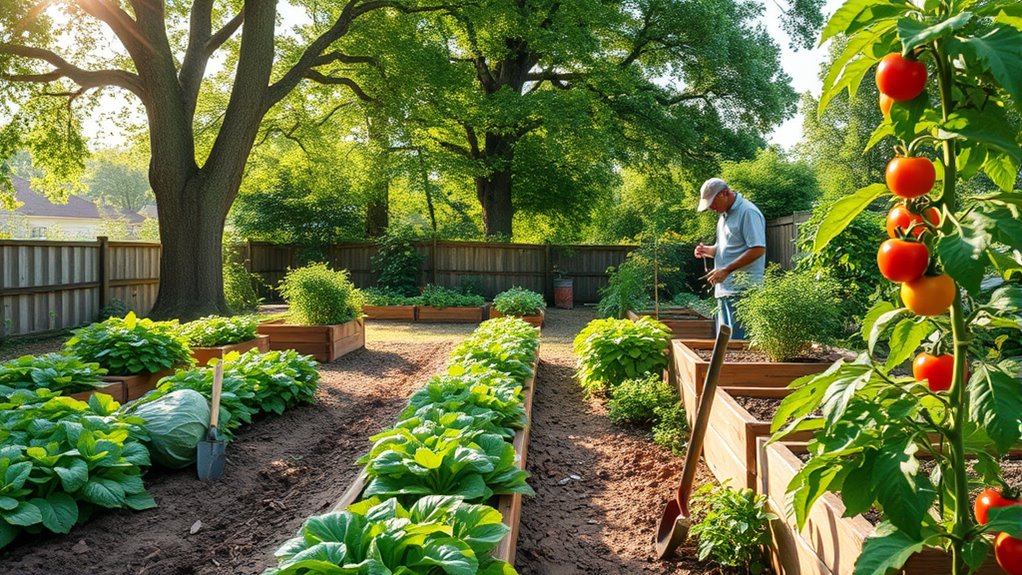Starting a budget garden is a smart way to cut grocery costs by growing your own vegetables and herbs at home. Planning carefully helps maximize space, select the best plants for your climate, and schedule harvests for continuous produce. Companion planting can also boost yields and reduce pests naturally. As you improve your skills, you’ll enjoy healthier plants and more savings. Keep exploring how to optimize your garden for even greater benefits.