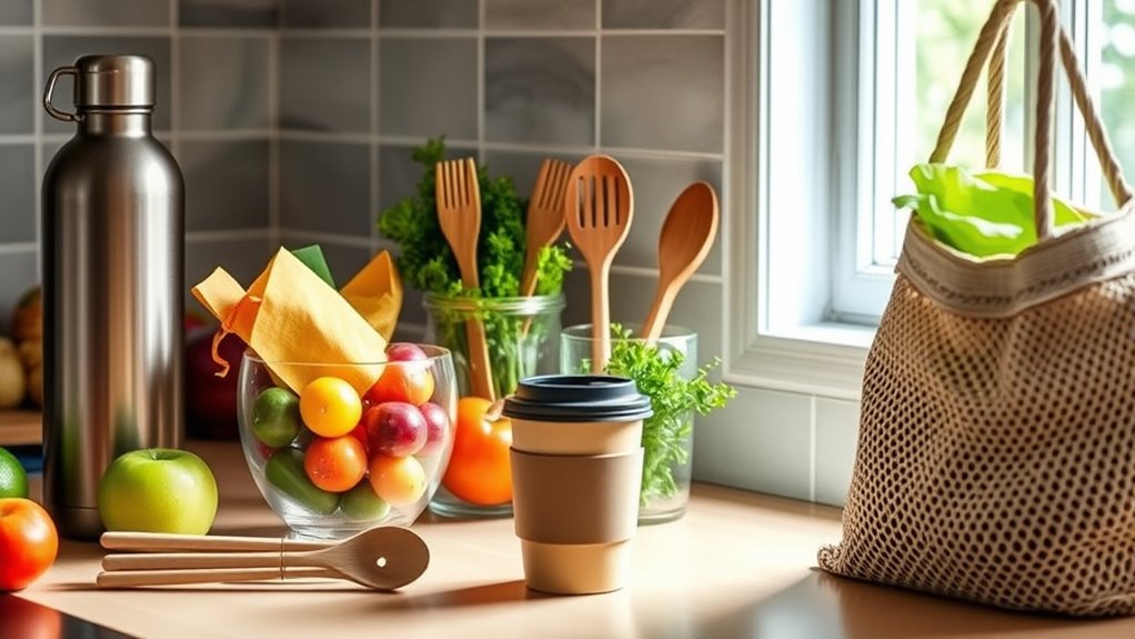Switching to reusable products can considerably cut your everyday costs and reduce waste. Opt for durable water bottles, coffee cups, and food containers instead of buying disposables. Use reusable produce bags, beeswax wraps, and cloth napkins to eliminate packaging expenses. Eco-friendly packaging choices and long-lasting household items also save money over time. By making these simple switches, you support sustainability and keep more money in your pocket—discover more ways to make smart, cost-effective choices.