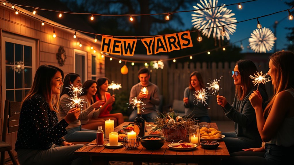 To celebrate New Year’s Eve on a budget, get creative with DIY decorations like paper banners, balloons, and repurposed jars. Opt for affordable snacks and drinks such as homemade punch and finger foods. Focus on simple, fun activities and personalized touches to make the night memorable without overspending. Planning ahead and using inexpensive materials will keep costs low while still creating a festive atmosphere. Want more tips? Keep exploring to make your celebration truly special.