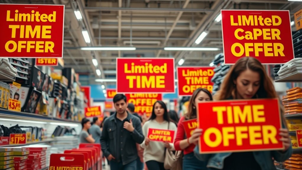 You might think you’re in control, but the scarcity appeal and urgency triggers secretly tap into your instinct to avoid missing out. These psychological factors make limited time offers so compelling because they create a sense of scarcity, nudging you to act quickly. The rush feels urgent, and your brain fears losing a great deal, which overrides your rational decision-making and pushes you to buy now rather than later.