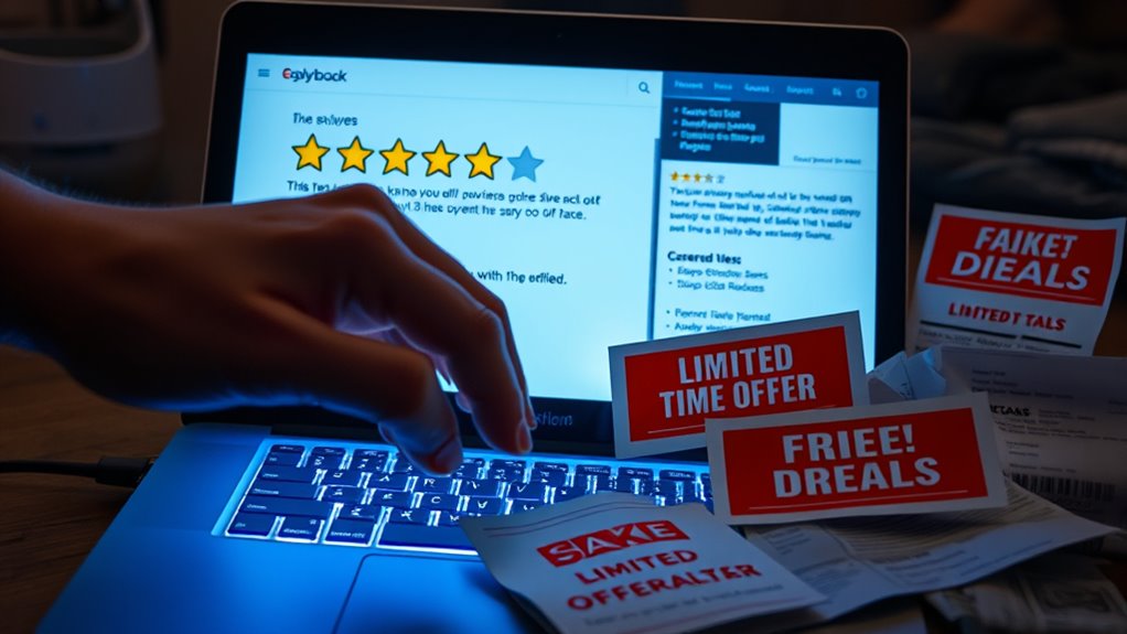 A fake deal often seems too good to be true, signaling review manipulation or scam tactics. Watch for deals with overly enthusiastic language, limited or no details, and suspiciously high discounts. If the deal’s inconsistent across platforms or if the seller pressures you to act fast, it’s a warning sign. These signs help you recognize fake deals and avoid falling for scams that prey on your trust.