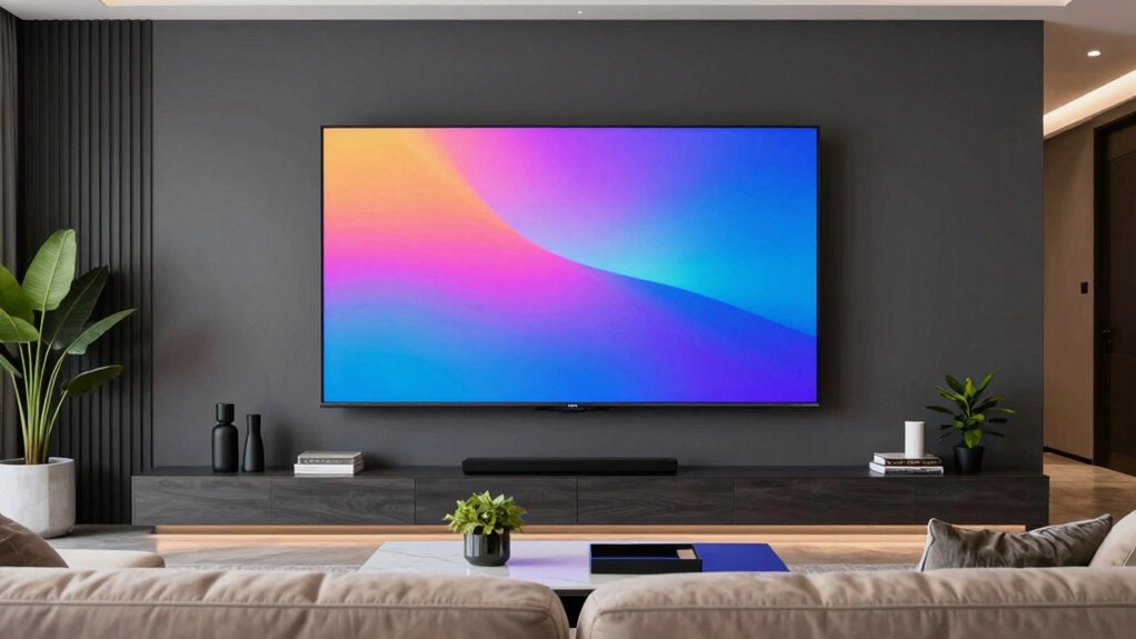 To enjoy the best viewing experience, you need to determine the right TV size relative to your seating distance. Start by measuring how far you sit from the screen. A good rule of thumb is to multiply that distance by 0.5 to 0.6, which gives you the ideal diagonal screen size in inches. For example, if you sit 8 feet away (96 inches), a TV between 48 and 58 inches works well. Remember, color calibration enhances picture quality, while sound optimization ensures audio matches your viewing comfort. Proper calibration guarantees vibrant colors and sharp images, making your viewing more immersive. Adjust your seating so you’re comfortably within this range, and you’ll enjoy a balanced experience that maximizes both visual and audio quality.