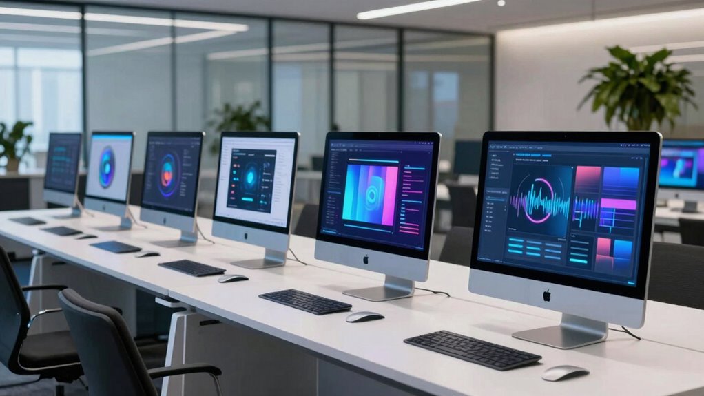 Are you getting the right audio and video quality from your all-in-one computer? To guarantee clear video calls, look for models with high-resolution webcams, like 720p or 1080p. For immersive sound, choose computers with Dolby Atmos or similar spatial audio tech, and built-in stereo speakers that offer enough volume and clarity. Microphone quality is just as important, so check for noise-canceling or array microphones that improve voice clarity during calls. Additionally, a display supporting HDR or high contrast ratios will deliver vibrant, true-to-life visuals. These features make a noticeable difference whether you’re working, streaming, or video chatting. Prioritizing top-tier audio and video capabilities guarantees a seamless, engaging experience every time you power up your all-in-one computer.