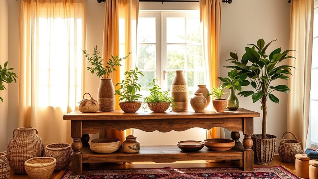 If you’re looking to elevate your living space with a stylish boho touch, I recommend exploring some of the best console tables that blend natural materials, unique designs, and functional storage. From woven rattan accents to wave-shaped panels, these tables add warmth and charm to any room. Many feature drawers, open shelves, and even charging ports for practicality. Keep browsing to find the perfect boho console table that matches your decor and space.