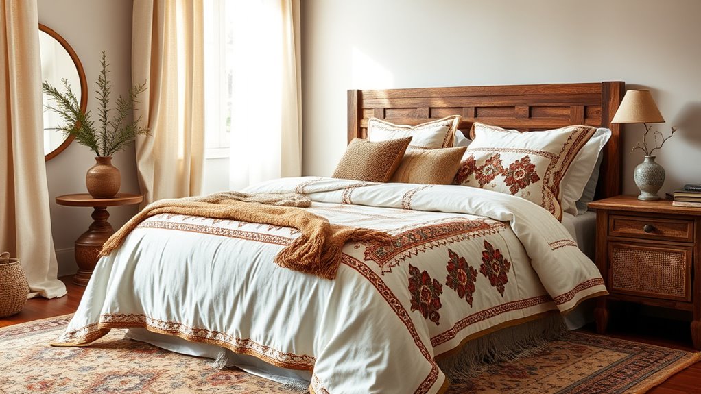 The patterns and styles you select for your boho duvet cover set can considerably influence the overall look and feel of your bedroom. Eclectic patterns like geometric designs, floral motifs, and tribal prints evoke a relaxed, artistic vibe perfect for a boho space. The color palette often includes earthy tones, warm terracotta, and muted pastels, creating a cozy, natural aesthetic. Reversible covers give you versatility, letting you switch patterns or colors to match different decor moods effortlessly. Textured details like tufting, embroidery, or jacquard weaving add depth and personality, enhancing visual interest. Choosing a pattern style that complements your overall decor—whether vintage, modern, or eclectic—helps craft a cohesive, inviting bedroom that truly reflects your personal style.