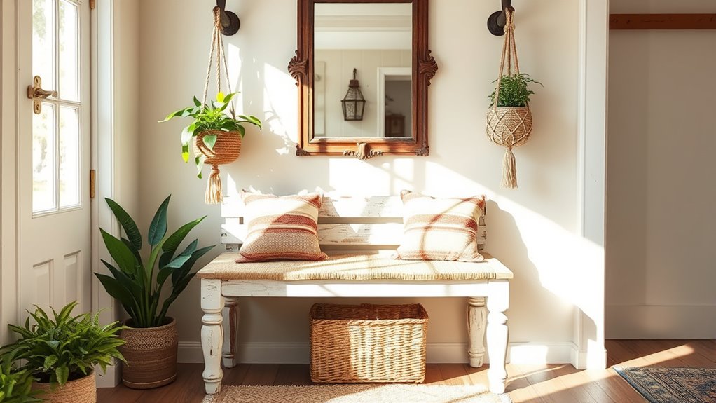 You can personalize your boho entryway bench by adding colorful cushions and textured throws that reflect your style. Incorporate small potted plants or hanging planters for a lively touch. Hang artwork or decorative mirrors above it to create visual interest. Use vintage baskets or woven trays on the bench for storage and charm. Don’t forget to add meaningful accessories, like travel souvenirs or handmade crafts, to make it uniquely yours.