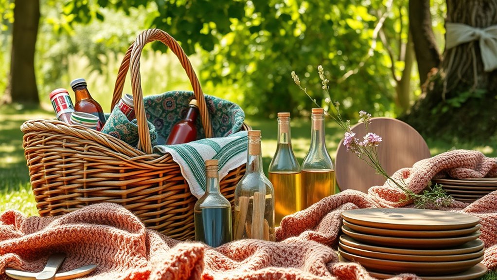 Yes, many boho picnic baskets come with clever storage options for accessories. Picture slipping your wine opener, napkins, and utensils into charming, woven pockets or compartments integrated into the basket’s design. These thoughtful touches keep everything organized and easily accessible, making your picnic experience smoother and more enjoyable. I love how these baskets blend rustic charm with practical storage, so you can focus on relaxing and soaking up the sunshine.