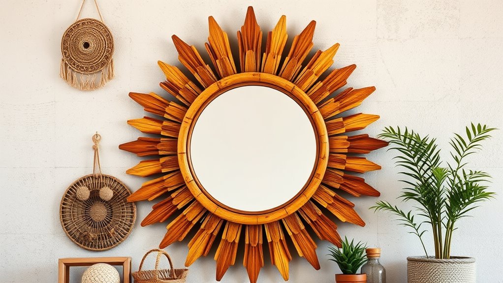 If you’re looking to elevate your home with boho charm, I recommend checking out some top picks like wicker, beaded, and handcrafted wooden mirrors. Sets with unique shapes, vintage finishes, and mixed textures add warmth and personality to any space. Whether you prefer arched, square, or round designs, there’s a perfect mirror to match your style. Keep exploring for more stunning options that can truly transform your decor effortlessly.