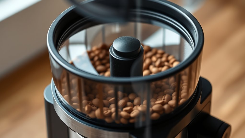 Since noise levels can impact your daily coffee routine, it’s important to contemplate how loud a burr grinder is before making a purchase. Burr grinders generally operate more quietly than blade grinders, thanks to their slow, consistent grinding mechanism. Most produce noise levels between 60 and 80 decibels, comparable to normal conversation or background music. If you prefer a quieter experience, consider conical burr models, which tend to generate less noise than flat burr grinders because of their design and lower RPM. Some grinders even incorporate noise-dampening materials or insulated casings to minimize sound further. Keep in mind that finer grind settings usually produce more noise than coarser ones, so your preferred grind size can also influence the overall noise level during operation.