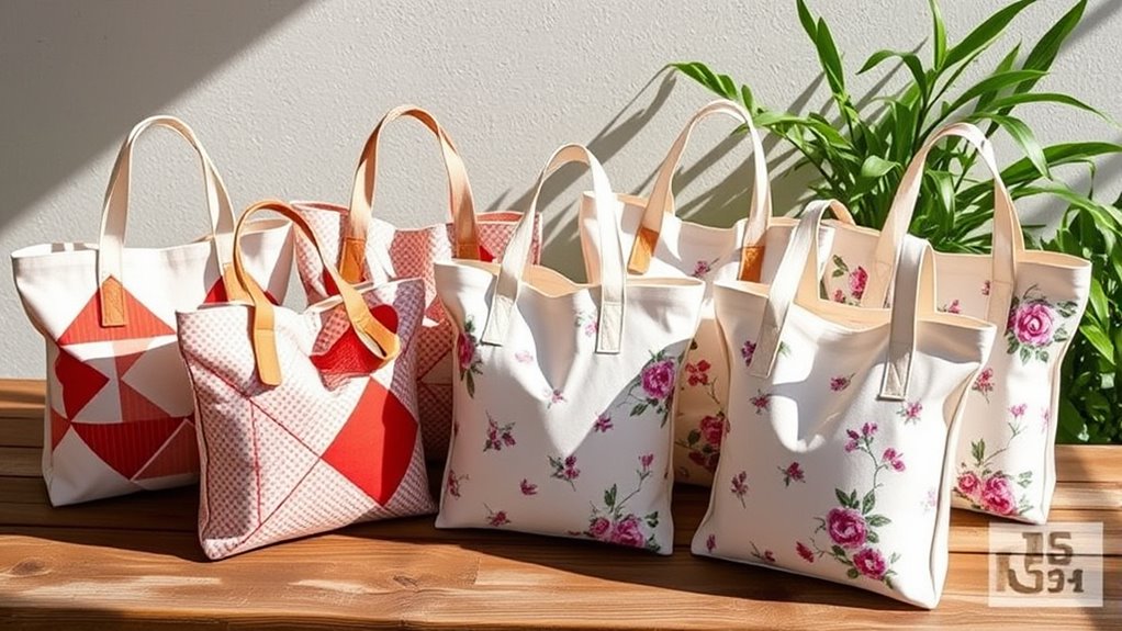 Eco-friendly canvas tote bags are made from natural, biodegradable materials like cotton or hemp, making them a sustainable choice for reducing environmental impact. These materials not only break down naturally but are often sustainably sourced, ensuring minimal ecological footprint. Reusable canvas totes help cut down plastic waste and lessen the environmental harm caused by single-use plastic bags. Many eco-friendly options are designed for durability, encouraging long-term use and reducing the need for frequent replacements. Additionally, these bags often feature non-toxic dyes and are produced through sustainable manufacturing processes, further lowering their ecological footprint. To guarantee a truly eco-conscious purchase, look for certifications or labels that verify the product’s sustainability. Choosing eco-friendly tote bags aligns your style with environmental responsibility.