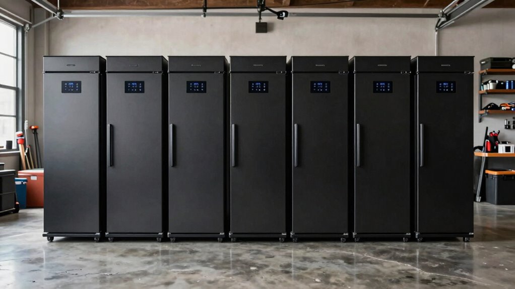 Are you aiming to save money on energy bills while keeping your garage freezer running efficiently? Focusing on energy efficiency ratings is key. Look for models with high ratings, like those with ENERGY STAR certification, which signifies lower electricity use. These freezers often feature advanced compressors and superior insulation, helping them maintain ideal temperatures with less power. Check the annual energy consumption in kilowatt-hours (kWh) to compare efficiency across different models. An adjustable thermostat allows you to fine-tune temperature settings, further reducing energy waste. Not only does choosing an energy-efficient freezer cut your utility bills, but it also minimizes your environmental impact. Prioritizing these features ensures your garage freezer operates effectively without unnecessary energy drain.