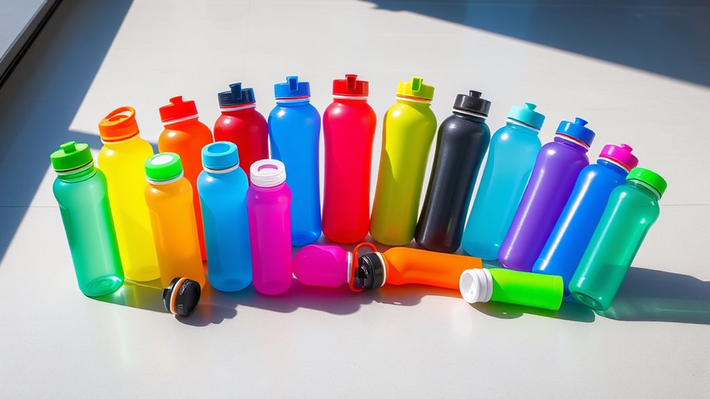 You’ll be glad to know that most collapsible bottles are BPA-free and food-grade, making them safe for everyday use. I’ve seen these bottles made from high-quality, non-toxic materials that won’t leach chemicals into your water. Imagine sipping fresh water from a flexible, safe container designed for convenience without compromising your health. Always check product labels to verify they specify BPA-free and food-grade certifications before buying—I do this to stay safe.