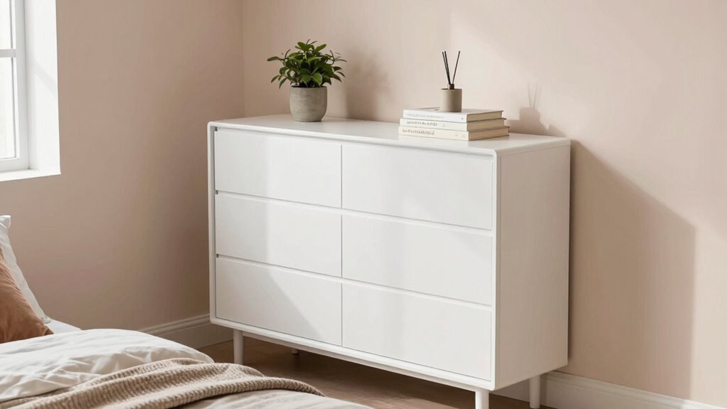 Choosing a dresser that complements your small bedroom decor is like finding the perfect puzzle piece. I’d look for pieces that match your color scheme and style—sleek and modern, rustic, or minimalist. Opt for pieces with clean lines and lighter shades to make the space feel larger. I also suggest considering multifunctional furniture to save space while adding style. Balance is key to creating a cozy, harmonious room.