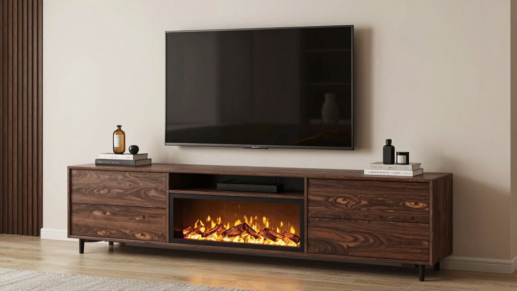 When choosing an electric fireplace TV stand for your 75-inch TV, I consider several key factors to guarantee it fits my needs. Size compatibility, storage options, safety features, style, and heating capabilities all play a role in making the right choice. Let’s explore these points so you can find the perfect fit for your space.