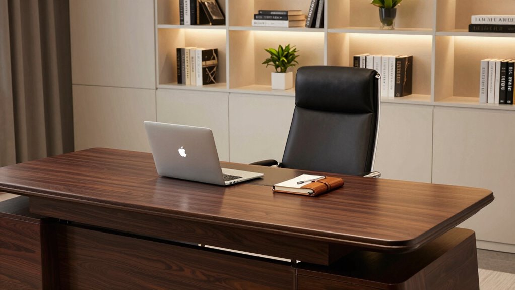 Choosing the right style and design for an executive desk involves more than just aesthetics; it’s about guaranteeing the piece complements your home office’s overall decor and suits your work habits. Whether you prefer modern, rustic, industrial, or traditional, the desk should blend seamlessly with your space. Functional features like integrated storage, cable management, and ergonomic design can boost productivity and comfort. The visual appeal, such as wood grain finishes or sleek metal accents, impacts the room’s ambiance and your motivation. Opting for durable materials like engineered wood or metal ensures the desk keeps its appearance over time, even with daily use. Reversible or modular designs also offer flexibility, allowing you to customize or rearrange your workspace as your needs evolve.