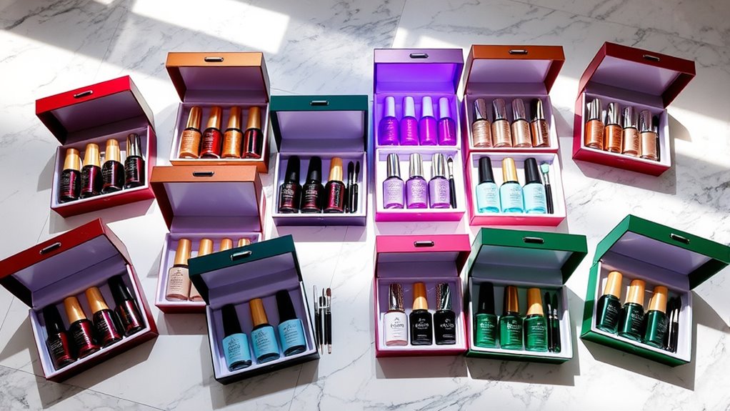 If you’re looking to elevate your manicure game, I recommend checking out these top gel nail‑polish kits. They offer a variety of shades, professional-grade tools, and long-lasting formulas that can give you salon-quality results at home. Most come with UV/LED lamps, easy-to-use applicators, and plenty of color options to suit any style. To find the perfect fit for your needs and discover more about their features, keep exploring these options.