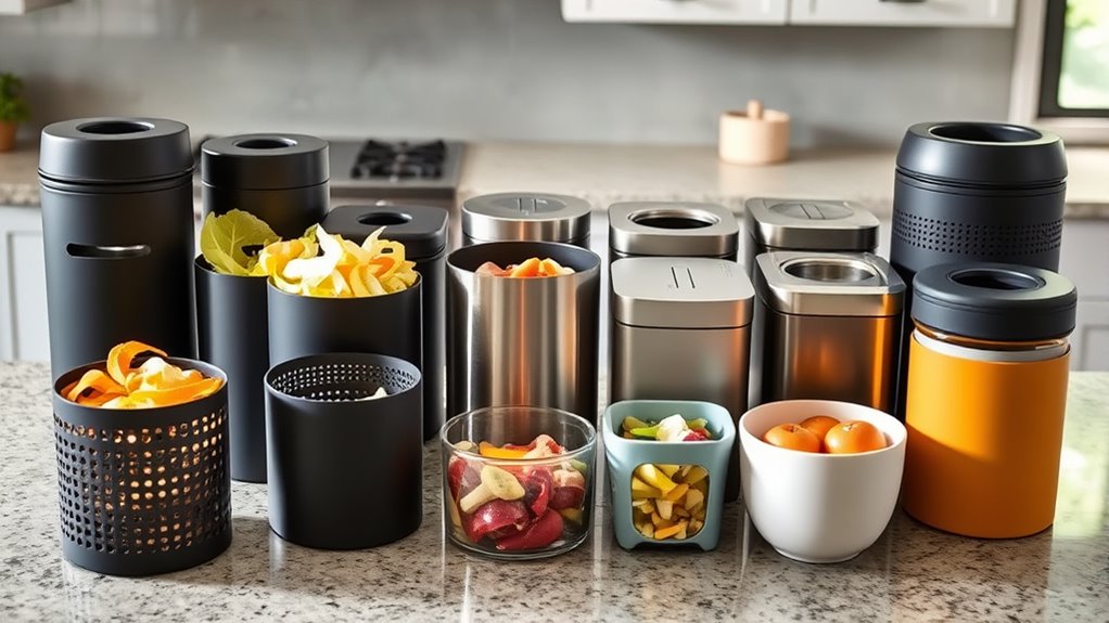 If you’re looking for the best kitchen compost bins to make eco-friendly waste easy, I recommend options like Utopia Kitchen, OXO, EPICA, and Beautiful Kitchen, which combine durable materials with odor control features. Sizes vary from 1 to 3.6 gallons, fitting well into most kitchens, and many have removable liners for simple cleaning. Choosing a bin with charcoal filters and tight lids is key for odor-free composting. Want to find out which model suits your needs? Keep exploring for more details.