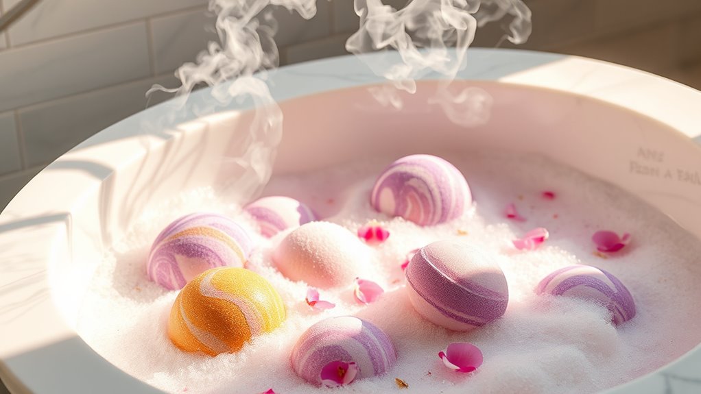 Price range is a key factor to contemplate when selecting luxury bath bombs, as it often reflects the quality of ingredients and craftsmanship involved. Generally, they cost between $5 and $15 per piece, with premium sets being more expensive due to high-quality ingredients and unique fragrances. Larger or individually wrapped bombs tend to have a higher price, highlighting their size and presentation. Organic, natural, or vegan formulations usually come with a higher price tag compared to synthetic options. Additional features like embedded jewelry, flower petals, or therapeutic essential oils can also influence the cost. While budget-friendly options might sacrifice some natural ingredients or luxury touches, higher-priced sets typically emphasize artisanal craftsmanship and premium components, ensuring a more indulgent spa-like experience.