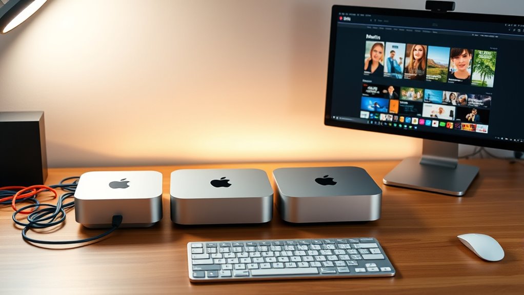 Ensuring your Mac Mini is compatible with your existing devices is essential for a smooth media server setup. First, make sure it supports the latest macOS updates to stay compatible with current media apps and device protocols. Check that it has the necessary ports—Thunderbolt, USB-C, HDMI, and Ethernet—to connect all your peripherals and devices seamlessly. Compatibility with Apple’s ecosystem is also vital, especially if you plan to share media across iPhone, iPad, or Apple TV. Additionally, verify that its hardware features, like Wi-Fi 6E and Bluetooth 5.3, align with your network and wireless devices for reliable streaming. Ultimately, confirm that the Mac Mini can run third-party media server software and plugins needed for your media management, ensuring a smooth, integrated experience.