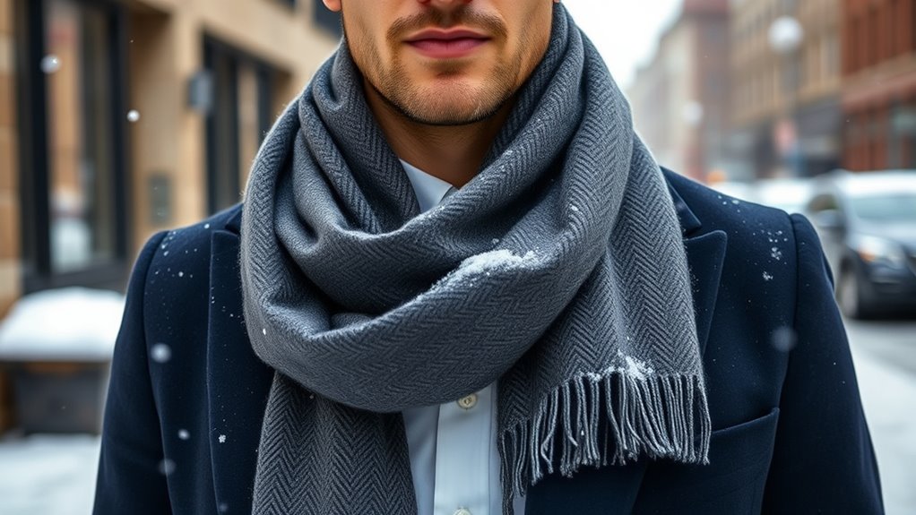 There are plenty of style and design options to contemplate when selecting a men’s wool scarf, making it easy to find one that complements your wardrobe. You can choose from classic plaid patterns, solid colors, or textured knits, offering versatility for different looks. Design choices range from lightweight, fashion-forward pieces perfect for milder weather to thick, insulated scarves built for extreme cold. Length and width also matter—longer scarves provide more styling options like wrapping or knotting, while narrower ones give a sleek, minimalist appearance. Popular patterns such as tartan, herringbone, and plain weave each bring a unique aesthetic and level of formality. Selecting the right style and design allows you to enhance your outfit, whether casual or formal, for a polished winter look.