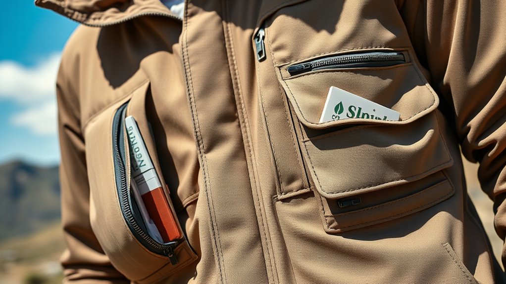 When selecting a multi-pocket travel jacket, security and accessibility are top priorities to keep your valuables safe and essentials within reach. Look for jackets with multiple secure pockets, especially hidden or RFID-lined ones, to prevent pickpocketing and unauthorized access. Zippered or snap-secured compartments add extra protection, reducing the risk of items falling out or being stolen in crowded areas. Strategic pocket placement, like on the chest, inside, or at the back, ensures quick access without sacrificing a sleek appearance. Features like pull tabs or magnetic closures make opening and closing pockets effortless, so you can access passports, tickets, or phones swiftly. Prioritizing these factors guarantees your belongings stay safe and accessible during all your adventures.