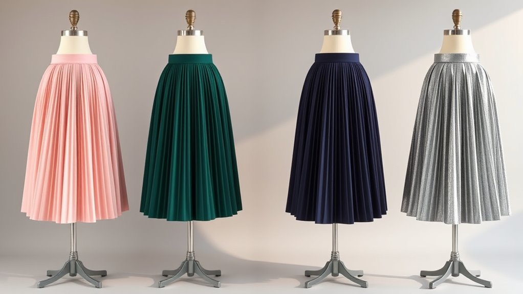 I recommend fabrics like polyester blends, nylon, and wool for durability and comfort. Polyester blends are resistant to wrinkles and hold their shape well, making them perfect for everyday wear. Nylon offers stretch and resilience, ensuring longevity. Wool, especially lightweight varieties, feels soft and breathes nicely, providing all-day comfort. Combining these fabrics in your pleated midi skirts guarantees a stylish look that lasts and keeps you comfortable all day long.