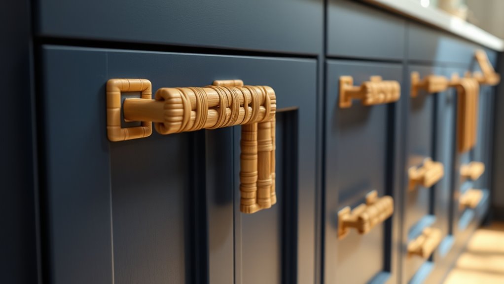 Looking for the best rattan cabinet pulls to boost your kitchen style in 2025? I’ve found a fantastic range that combines natural textures, artisanal craftsmanship, and boho, rustic, or coastal charm. From woven wicker and handcrafted rattan to jute rope and brushed brass finishes, these pulls are easy to install and add unique character to your furniture. Keep going to explore the top options that will transform your space with natural elegance.