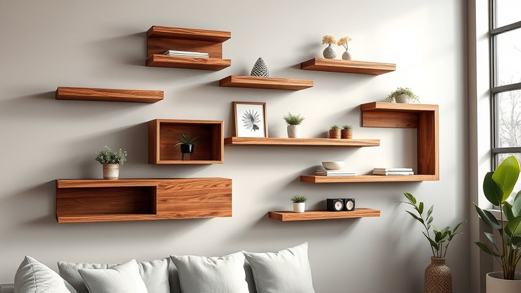 If you’re looking to elevate your space in 2025, I recommend exploring the 15 best reclaimed-wood floating shelves. These shelves are crafted from solid, authentic reclaimed wood like oak, pine, and walnut, offering rustic charm and durability. They come in various sizes, styles, and support weights, making them perfect for any room. With hidden hardware and easy installation, these shelves combine beauty and function effortlessly. Keep going, and you’ll discover all the key details to choose the perfect one for your space.