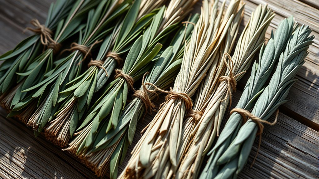 Sourcing sustainable sage is essential for ensuring that your cleansing rituals support both environmental health and cultural respect. I look for sage from reputable sources that prioritize eco-conscious harvesting, which helps preserve sacred plants and their ecosystems. It’s important to verify that the sage is grown without chemicals, pesticides, or artificial additives, indicating organic and sustainable farming practices. I also prefer products from small-scale growers or private farms that follow ethical harvesting methods, supporting local communities and responsible cultivation. Natural drying and hand-wrapping often signal traditional processing that maintains the plant’s integrity. Ultimately, I check for certifications or transparent sourcing info to confirm the sage’s eco-conscious and ethical origins, ensuring my practice aligns with environmental and cultural mindfulness.