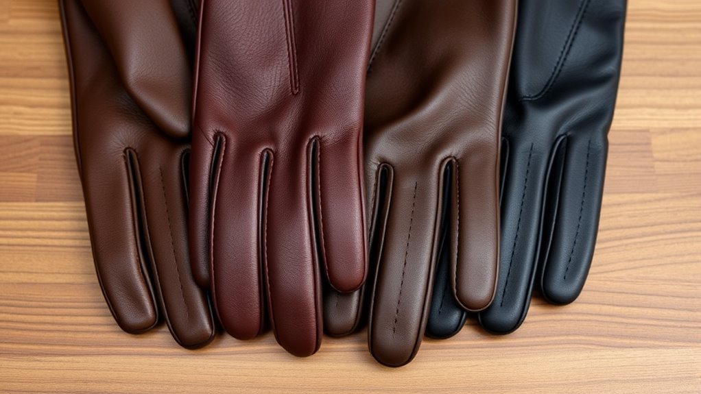 Maintaining your touchscreen leather gloves in good condition guarantees they stay comfortable, functional, and durable over time. Regularly wipe them with a damp cloth to preserve their appearance and prevent dirt buildup. Avoid exposing the gloves to excessive moisture or direct heat, as both can damage the leather and reduce their lifespan. Using a specialized leather conditioner every so often keeps the leather supple and prevents cracking. If odors develop, washing gently with mild soap and air drying in a well-ventilated area can help. For persistent smells, consider additional treatments tailored for leather. Proper storage is also vital—keep your gloves in a cool, dry place away from sunlight to extend their life and maintain touchscreen responsiveness. Proper care ensures your gloves stay looking good and functioning well.