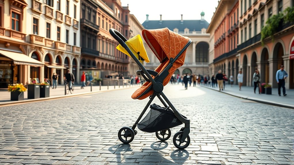 Choosing a travel stroller means paying close attention to its weight and portability, as these factors directly affect how easy it is to transport and store. A lightweight stroller, ideally under 15 pounds, makes lifting and carrying much simpler, especially when steering airports or busy streets. Compact folding mechanisms are essential; they allow the stroller to fold down small enough to fit into overhead compartments or car trunks effortlessly. Self-standing fold designs add convenience, letting you store the stroller upright without extra space. Carry handles integrated into the frame or fold assist features help with lifting and maneuvering. Materials like lightweight aluminum or carbon fiber frames strike the perfect balance between durability and weight, ensuring your stroller is sturdy but easy to carry wherever you go.