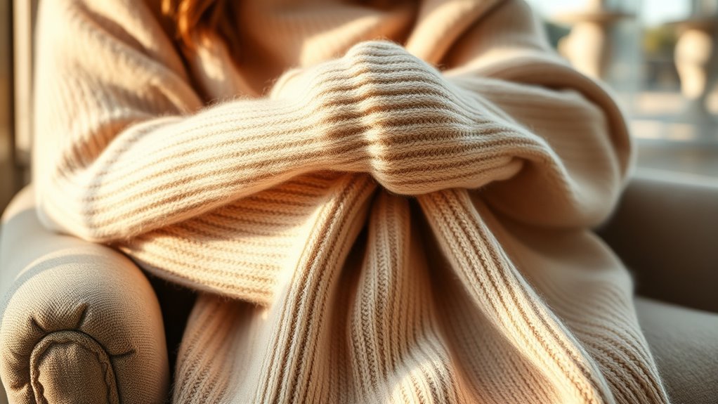 Choosing the right care routine for your cashmere sweaters is essential to keep them soft, looking their best, and lasting longer. I recommend gentle hand washing or dry cleaning to prevent damage. Harsh detergents or bleach can weaken fibers, cause fading, and lead to pilling, so it’s best to avoid them. After washing, always lay your sweater flat to dry—this helps preserve its shape and prevents stretching. Regularly brushing with a cashmere comb or garment brush reduces pilling and keeps the fabric looking new. When storing, use a cool, breathable container and add cedar blocks or lavender sachets to deter moths. Proper care guarantees your cashmere sweater remains luxurious, soft,, and beautiful for years to come.