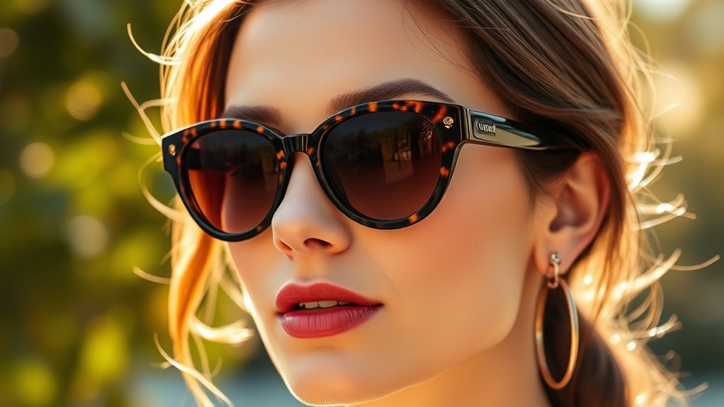 Selecting the right frame material is essential for guaranteeing your sunglasses are both durable and comfortable. High-quality options like acetate, metal, and premium plastic are key to longevity. Acetate frames are popular because they’re strong, flexible, and lightweight, making them comfortable for all-day wear. Metal frames offer a sleek, sophisticated look and tend to be more resistant to breakage than plastic. Choosing premium materials also helps prevent issues like color fading, cracking, or bending over time, keeping your sunglasses looking new. Additionally, authentic designer sunglasses often use hypoallergenic, high-grade materials that are safe for sensitive skin and provide extra comfort. Investing in quality frame materials assures your sunglasses remain stylish and reliable, no matter how often you wear them.