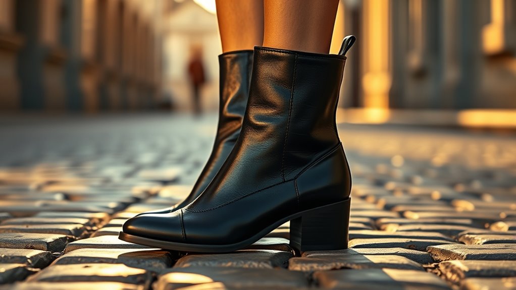 To guarantee all-day comfort in leather ankle boots, I focus on features like cushioned insoles that absorb shock, flexible outsoles for natural movement, and a supportive arch that reduces fatigue. A slightly heel helps with posture without causing strain, and breathable leather keeps my feet dry and comfortable. I also look for easy slip-on designs and padded collars for extra support, making my day worry-free and stylish.